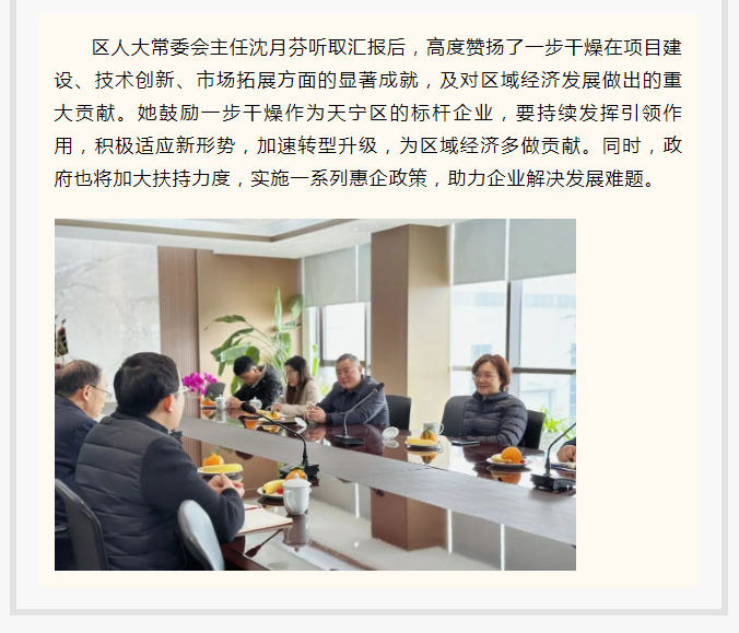 2025年3月7日上午,常州市天寧區人大常委會主任沈月芬率隊赴常州一步干燥設備有限公司調研,鄭陸鎮人大主席黃佳清陪同考察。一步干燥董事長查國才、總經理查文浩熱情接待。