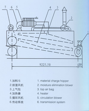 DWP型噴射氣流帶式干燥類型,熱風從狹縫或孔束流向下或向上同時噴向輸送帶上的物料,由于噴射氣速高達15m/s以上,故對流傳熱的膜極薄,傳熱系數大,干燥速度快。該設備用于不透氣類物料時,上面噴射氣流仍返回上面,下面噴出的氣流仍返回下面,再參與循環。對透氣性物料氣流束具有強穿透性及物料內部的擴散性。使用熱源可以是蒸汽、電、熱風爐及燃油煙通氣等。