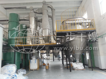 閃蒸干燥機主要由進風系統、加熱系統、加料系統、干燥主機、收料除塵系統、排風系統、控制系統等組成。工作時,濕物料由螺旋加料器進入干燥室,物料在干燥室中與高速旋轉的熱風相遇,細粉狀物料被熱風帶著向干燥室上端移動,不能帶走的物料落在干燥室底部,被底部的粉碎裝置打碎,物料被迅速分散,物料與熱風的接觸面積迅速增大。在離心力的作用下(頂部有分級裝置),達到干燥程度和一定細度的產品被吹出分級裝置,物料在此過程中得到快速干燥。